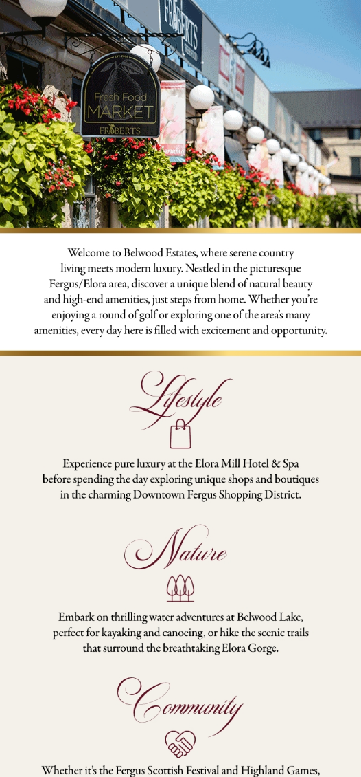 This exclusive estate community showcasing homes meticulously designed to capture the area’s scenic charm, coupled with a luxurious lifestyle including a premier golf club next door. Belwood Estates offers an exquisite retreat where nature, history, and sophistication blend seamlessly.